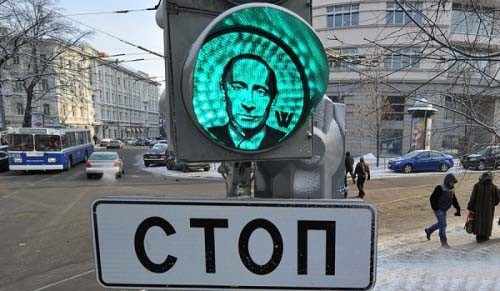 2012年2月13日,俄羅斯莫斯科街頭現(xiàn)“普京版交通信號(hào)燈”,支持者希望群眾為普京“亮起綠燈”。